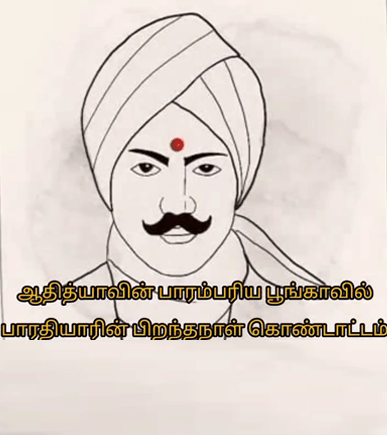 11ம் தேதி பன்முகக் கலைஞர் பாரதியின் பிறந்தநாள். பாரில் உள்ள அனைவரின் மனமென்னும் மண்ணில் புரட்சி என்னும் வித்தினை வித்திட்டு , அந்த விதைகள் முளைத்து, விதையின் வீரியம் விருட்சமாகி நம் ஆதித்யாவின் பாரம்பரிய பூங்காவில் மிளிர்கின்றது. சூரியத்துண்டுகள் இவர் கண்கள்; வீரத்தின் கூறுகள் இவர் மீசை; மொழியின் மகுடம் இவர் முண்டாசு; கோவத்தின் நிறம் இவர் திலகம்; பாரதியின் உருவப் படம் வரைந்து, அதனைச் சுற்றி எம் பள்ளியின் குட்டி பாரதிகள் .மக்கள் மனதில் வீரத்தினை வித்திட்டவர், இவர் தன் எழுதுகோலால் ஆங்கிலேயரின் செங்கோலை வீழ்த்தினார். காலத்தின் திறவுகோலை தன் எழுத்தில் வைத்து விட்டார் அத்தகைய உணர்ச்சிமிகு பொன்மொழிகளை இவர் பிறந்த தினம் 11 என்பதால் 11 மழலை பாரதிகள் , இவரின் பொன்மொழிகளை மொழிந்தனர் . தன் முண்டாசு மடிப்பினிலே, முத்தமிழ் முக்கனியாய் இனித்தவர்; அத்தகைய முத்தமிழால் அவர் எழுதிய கண்ணன் பாட்டில் இருந்து ஒரு குறு நாடகம் நடித்தும், பாரதியாரின் பிறந்த நாளைச் சிறப்பாக கொண்டாடியது எம் ஆதித்யாவின் பாரம்பரிய பூங்கா.